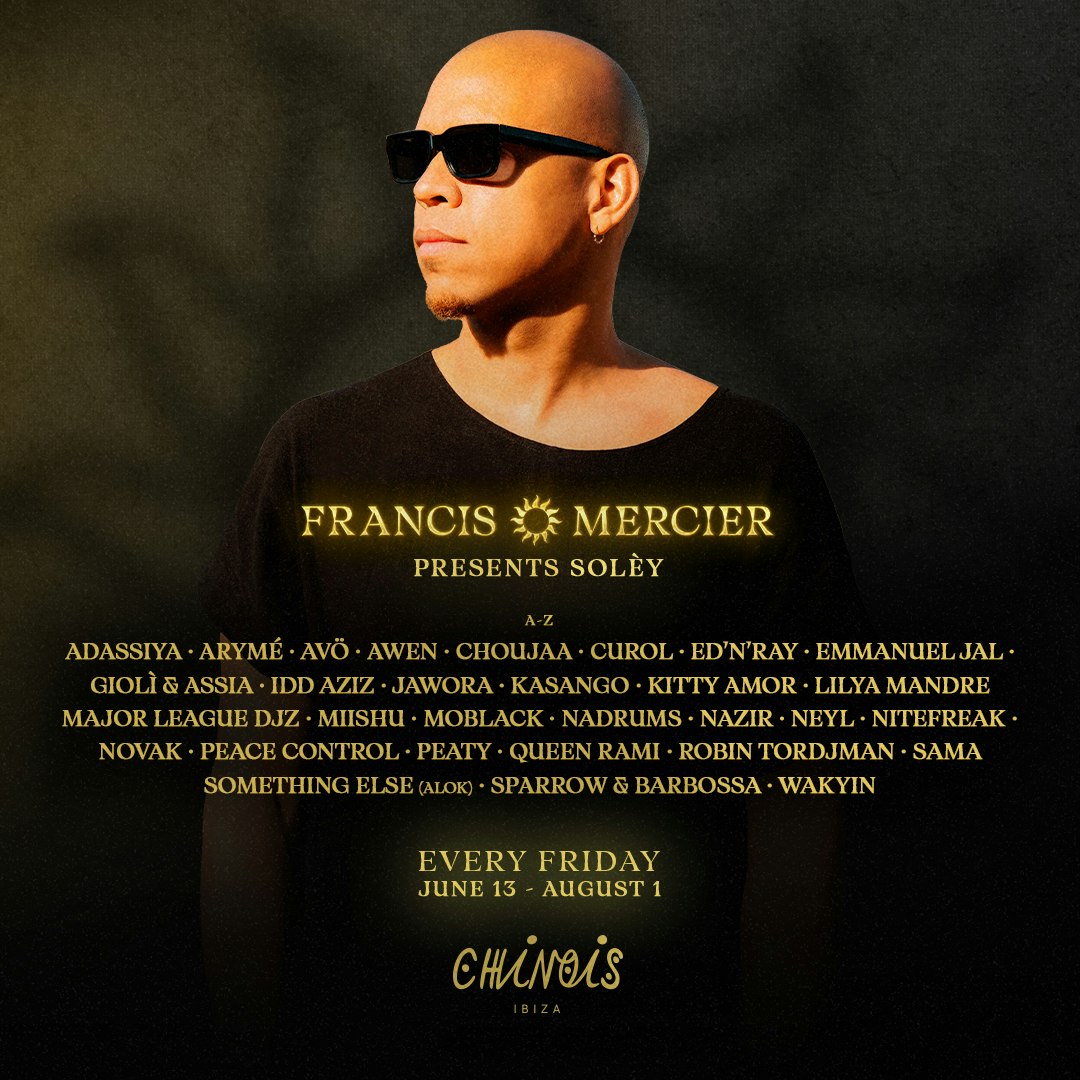 Internationally acclaimed Haitian DJ and producer Francis Mercier returns to Ibiza this summer for his debut 8‑week Solèy residency at Club Chinois. To weave a rich tapestry of global sounds, the residency will bring together artists from all corners of the world.